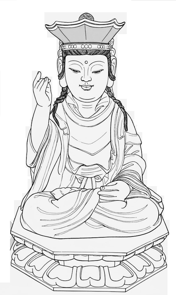 - 상징: 명상하거나 불경을 든 모습. 탑(塔), 혹은 불자가 지물을 들고 시봉하는 모습. 염주나 보주를 든 모습